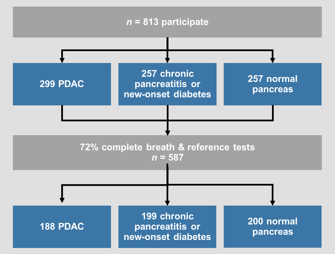 We carried out a discovery study to identify potential biomarkers to detect pancreatic ductal adenocarcinoma [Br. J. Surg. 2018, 105, 1493-1500]. This showed a distinctive profile of VOCs for pancreatic ductal adenocarcinoma in the exhaled breath. The area under the receiver operator characteristic (AU-ROC) curve was 0⋅901 to distinguish between pancreatic cancer and benign pancreatic conditions.